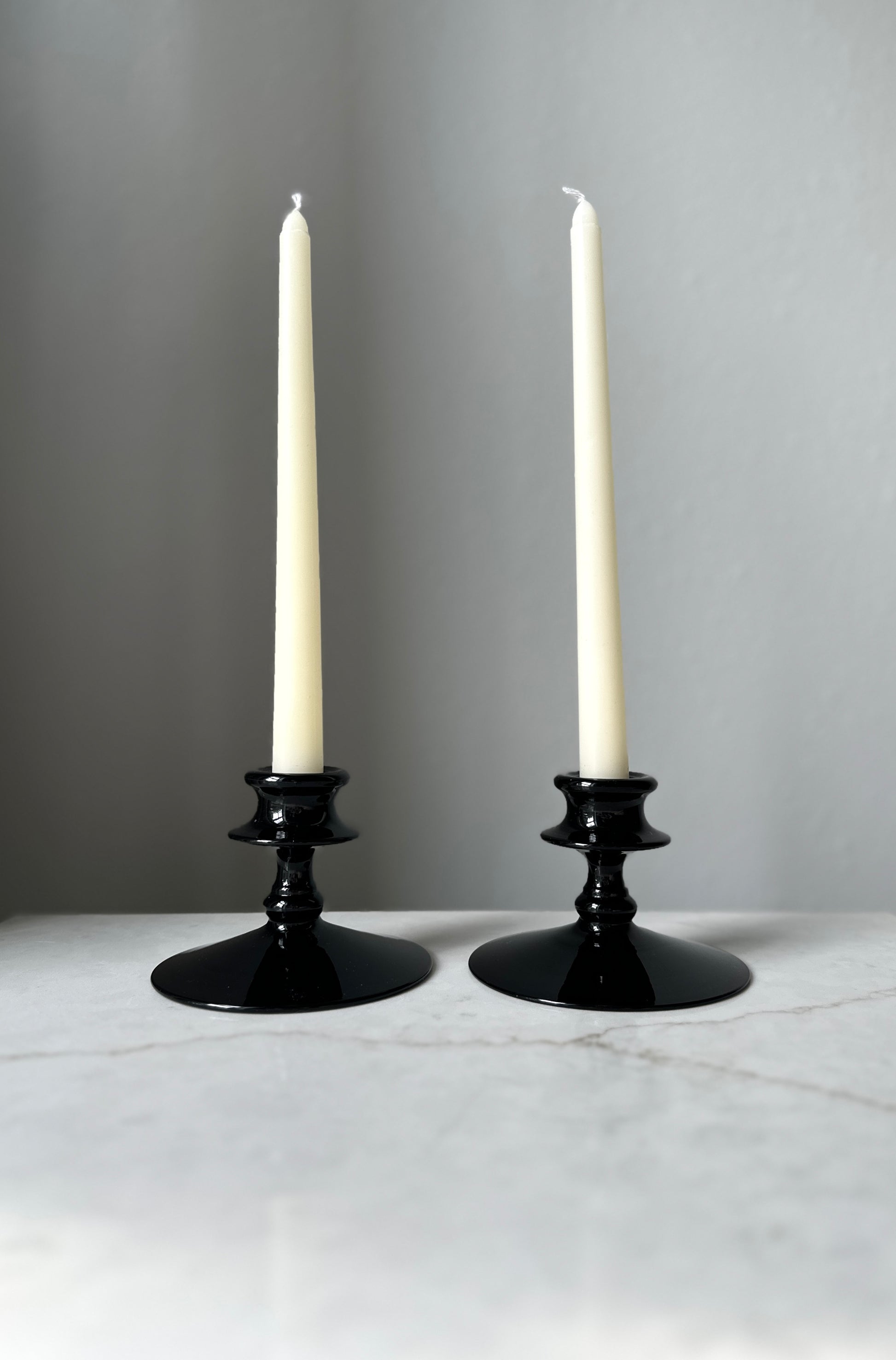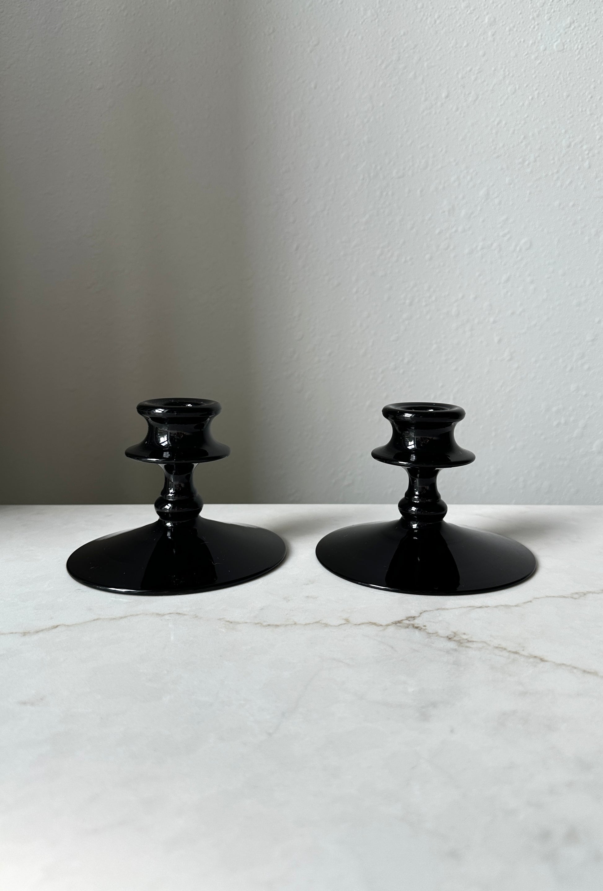 A set of 2 matching mid-century black glass taper candle holders. Good condition, no chips. 4.5” x 3.25” tall