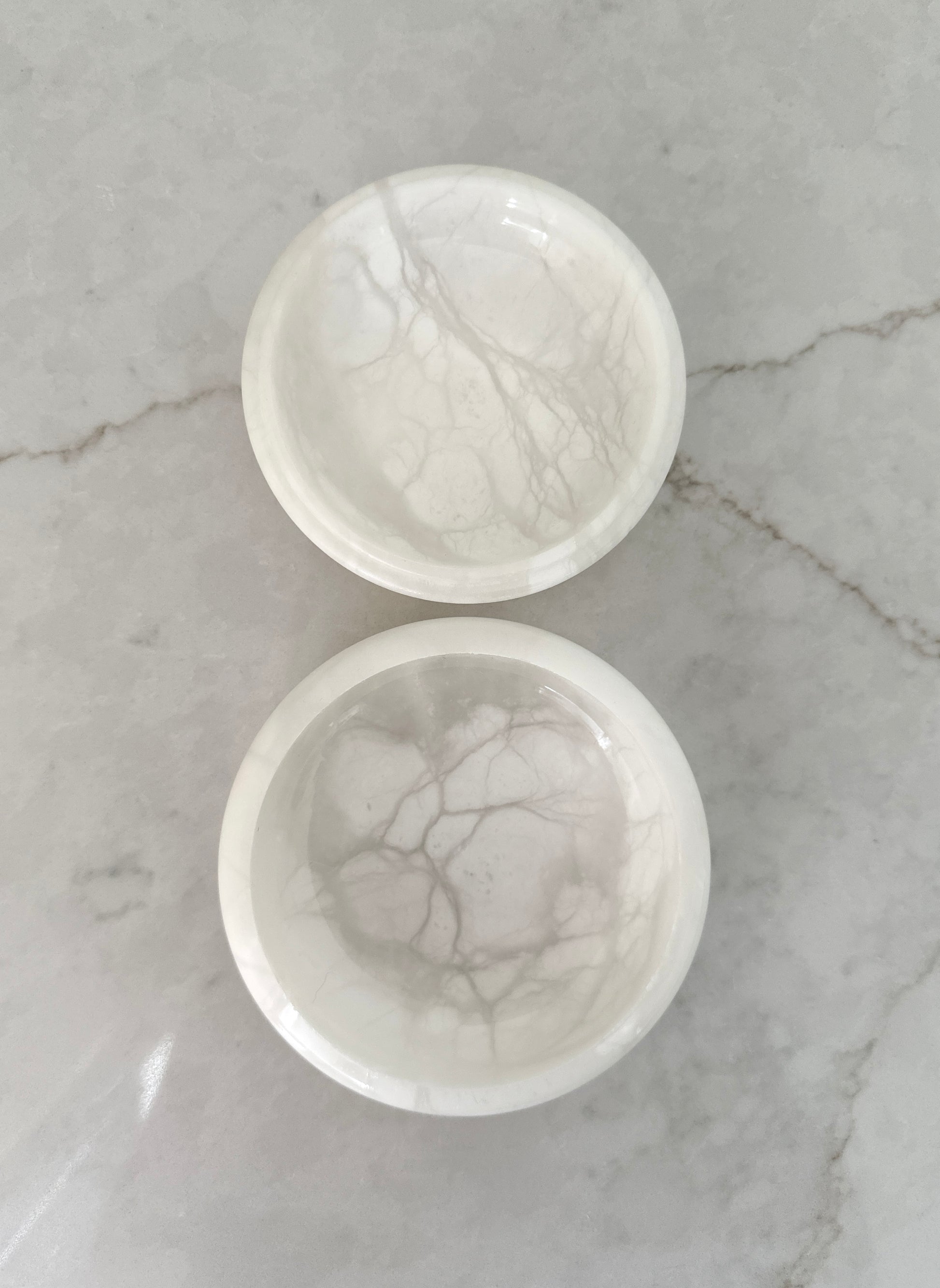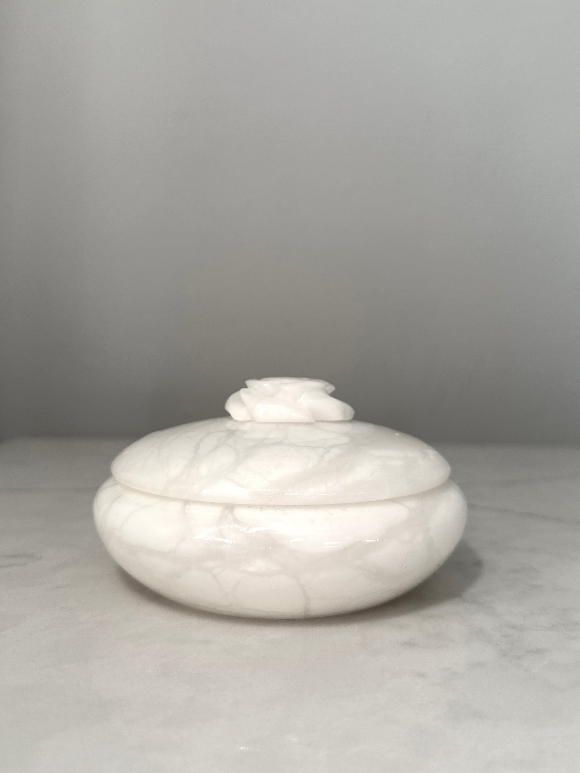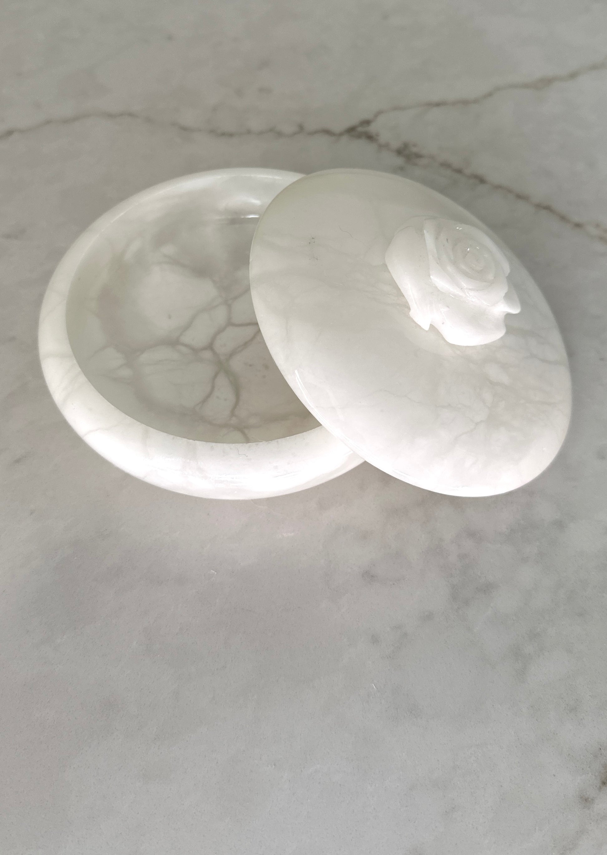 Pretty trinket dish in shade of ivory alabaster. Unsure of age but I believe it’s newer, shows virtually no wear. Scali Italy sticker. Approx 5” across.
