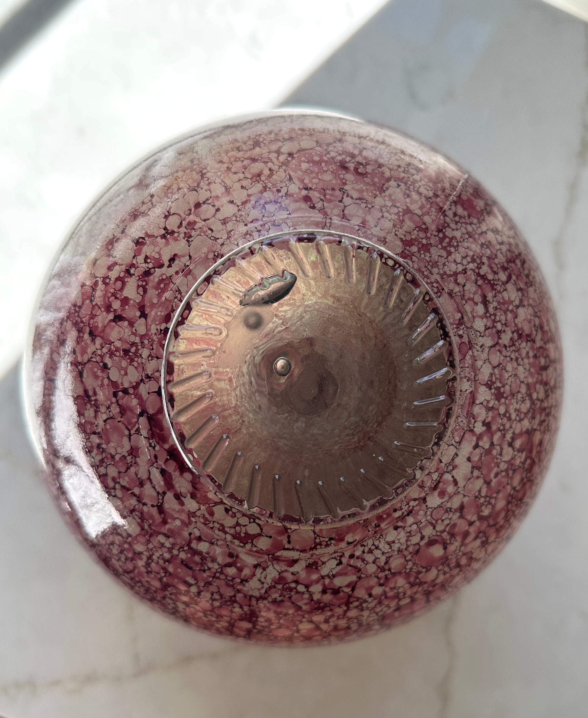 Beautiful Raindrop Spanish glass vase with a unique burgundy speckled tone. Excellent condition with no chips or cracks. 8-1/2" tall and 7" wide