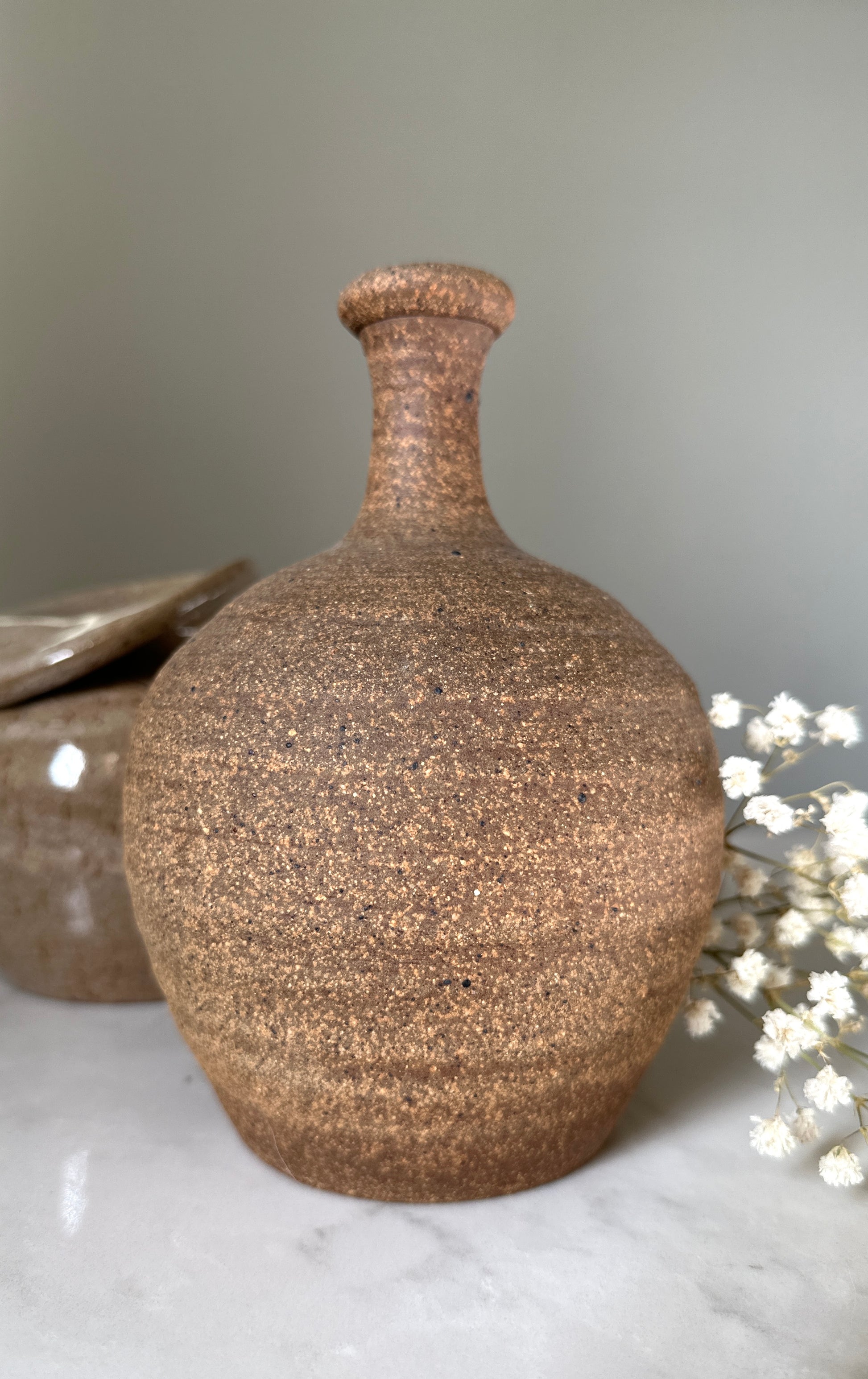 Contrasting textures on these two unique vintage pottery vases. No signatures but appear handcrafted. Good condition. 4” x 5” & 4” x 7”