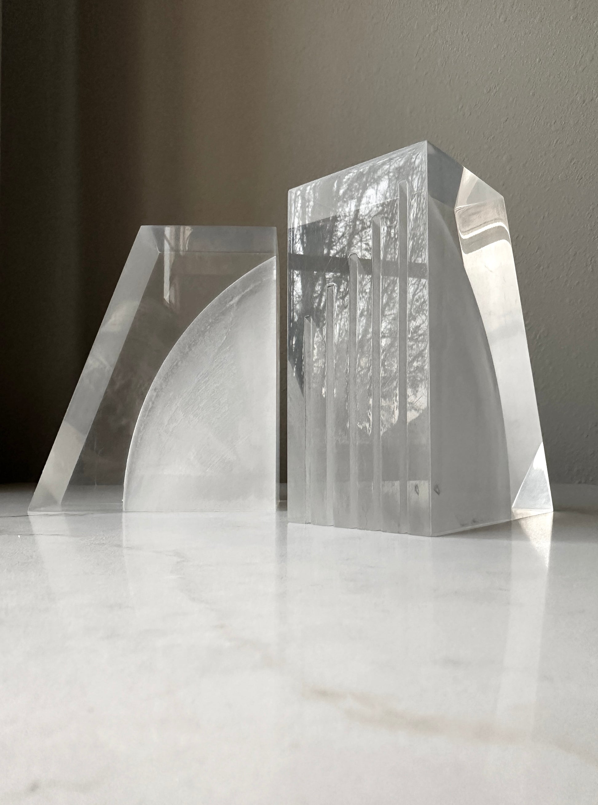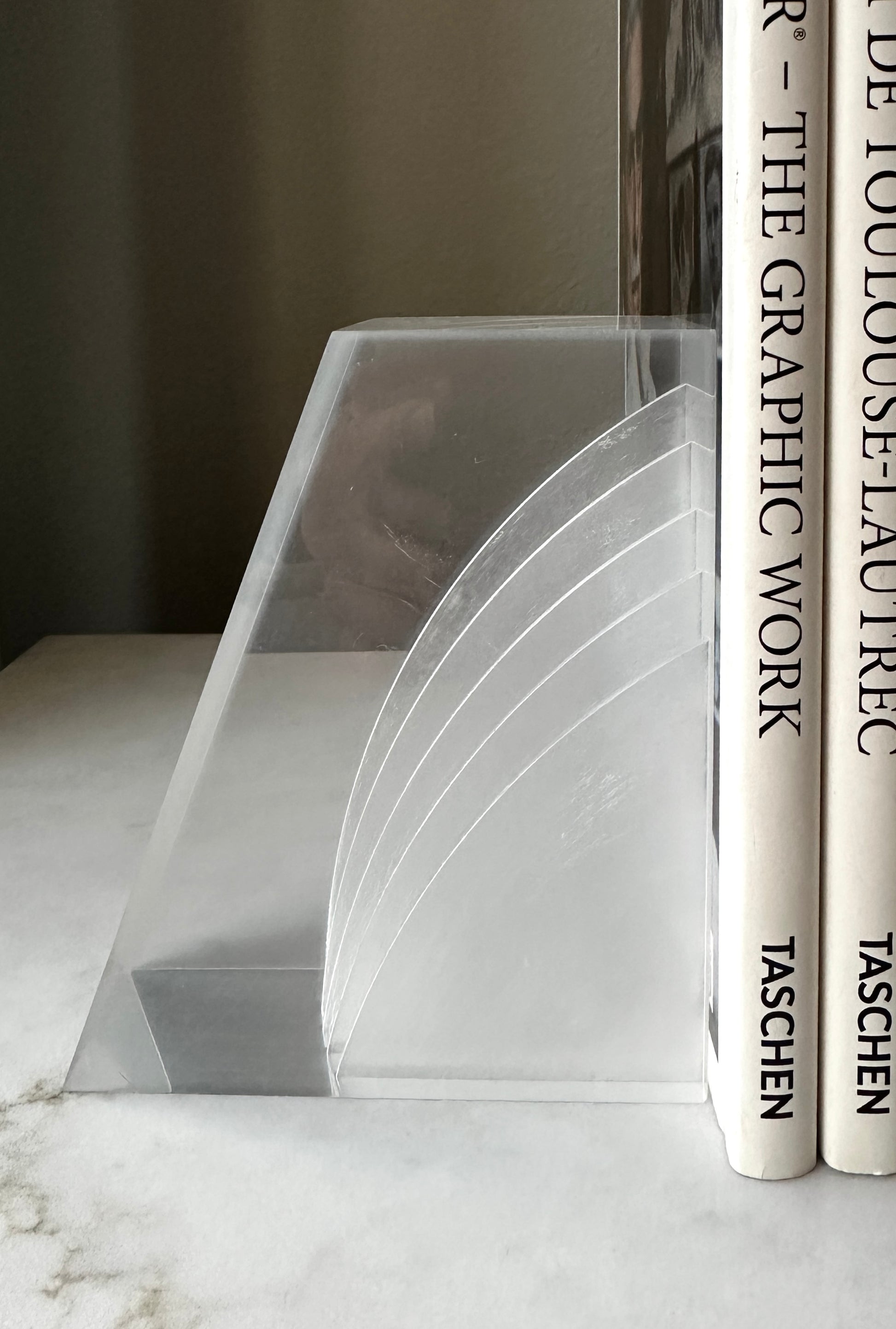 A striking set of Astrolite bookends with unique details. They have light surface wear common with Lucite but are overall in very good vintage condition. Each measures approximately 5 inches tall by 4 inches wide by 2 1/2 inches thick.