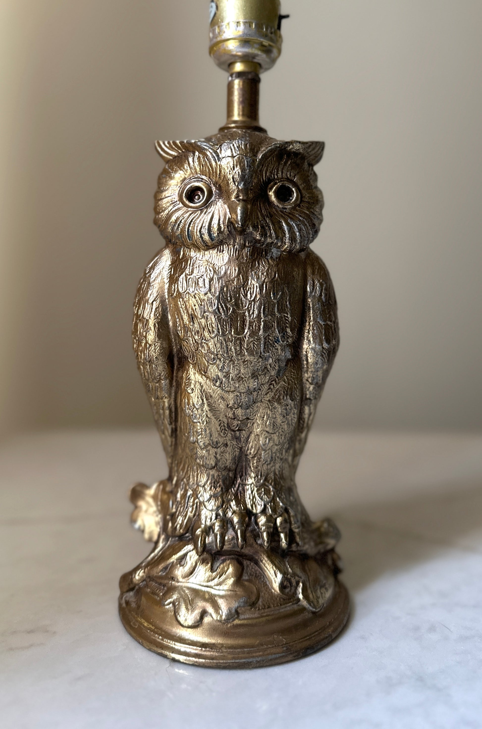 Quality gilded owl table lamp by Loevsky & Loevsky, marked on the backside L&L. Sold in Belgium by Deknudt from the 1970’s. Good condition with a bit of vintage patina; in working order when plugged in but switch does not turn, would need to be rewired. 4” x 4” x 9.5”